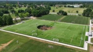 Capta vídeo momento en que socavón ‘devora’ parte de un campo de fútbol