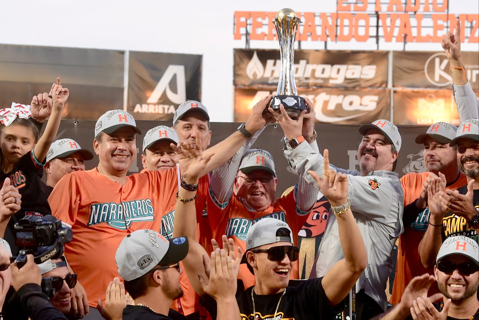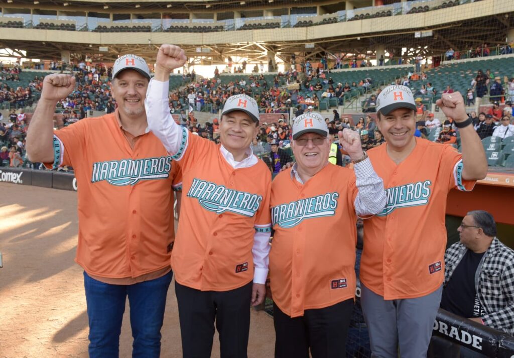 El Presidente Municipal Antonio Astiazarán acompañó en el recinto beisbolero al Gobernador de Sonora Alfonso Durazo y a directivos del Consejo de Naranjeros, encabezados por su vicepresidente Enrique Mazón Cubillas, y todos dieron la bienvenida a los campeones y su cuerpo técnico.