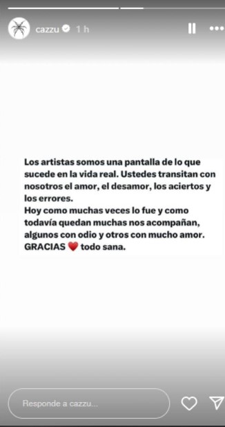 Por su parte, Julieta Cazzuchelli, conocida artísticamente como Cazzu, también se dirigió a sus seguidores en un mensaje lleno de reflexión y gratitud: «Los artistas somos una pantalla de lo que sucede en la vida real. Ustedes transitan con nosotros el amor, el desamor, los aciertos y los errores. Hoy como muchas veces lo fue y como todavía quedan muchas nos acompañan, algunos con odio y otros con mucho amor. GRACIAS todo sana».