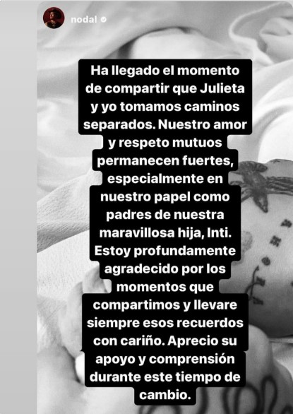 Nodal, conocido por su éxito «Ya no somos ni seremos», utilizó su cuenta de Instagram para hacer el anuncio. «Ha llegado el momento de compartir que Julieta y yo tomamos caminos separados. Nuestro amor y respeto mutuos permanecen fuertes, especialmente en nuestro papel como padres de nuestra maravillosa hija, Inti. Estoy profundamente agradecido por los momentos que compartimos y llevaré siempre esos recuerdos con cariño. Aprecio su apoyo y comprensión durante este tiempo de cambio», escribió el músico en una historia.