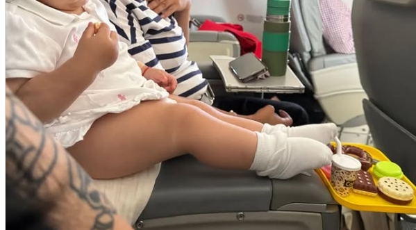 En la imagen publicada en sus historias de Instagram, se ve a Inti vestida con un delicado atuendo rosa mientras está sentada en un asiento de avión junto a su madre. Aunque Cazzu evitó mostrar el rostro de su hija, se alcanzaron a apreciar sus pequeñas piernas y una bandeja con comida de juguete, revelando cómo entretiene a la bebé durante los vuelos.