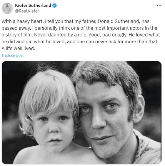 “Con gran pesar les digo que mi padre, Donald Sutherland, ha fallecido. Personalmente me parece uno de los actores más importantes de la historia del cine. Amaba lo que hacía e hizo lo que amaba, y nunca se puede pedir más que eso. Una vida bien vivida”.
