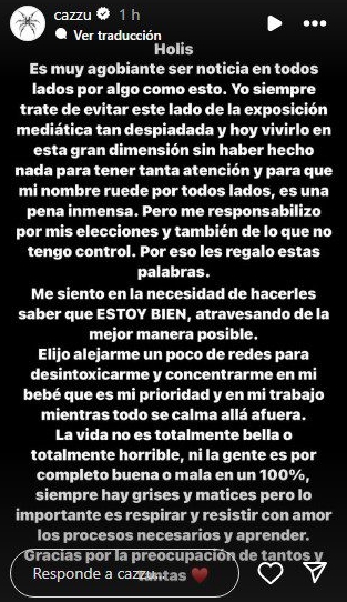 En un mensaje compartido en sus historias de Instagram, Cazzu se refirió al controvertido romance entre Nodal y la hija de Pepe Aguilar. Afirmó que no le resulta agradable ser el centro de atención por algo que no hizo, pero asumió la responsabilidad de sus decisiones.