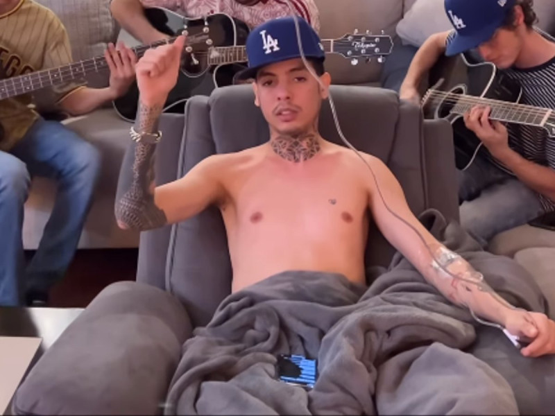 En Instagram, Natanael Cano publicó un video donde se le ve sentado en un sofá con una bata de hospital abierta del pecho, con sondas en el brazo. Sin embargo hay tres guitarristas detrás de él.