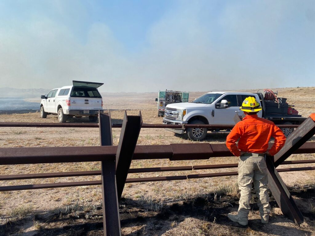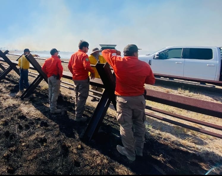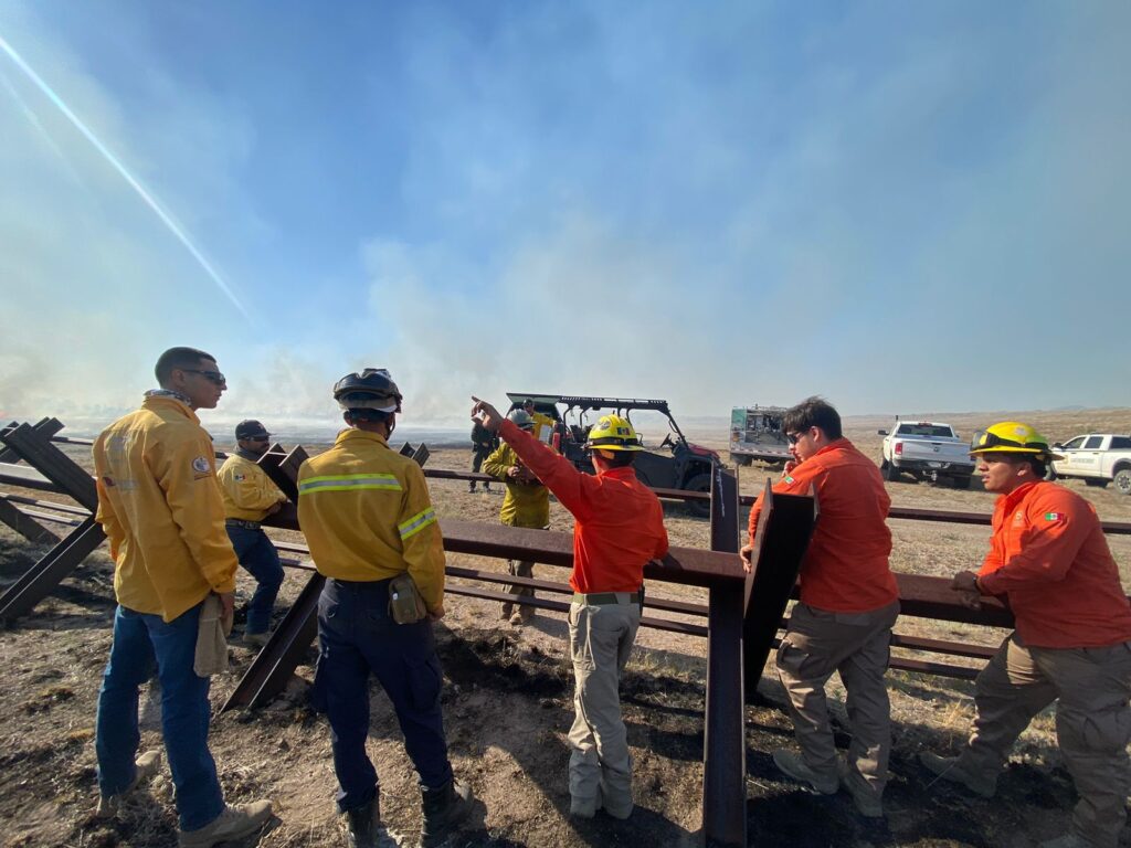 Brigadistas de Sonora y de Arizona sostuvieron un encuentro en la línea fronteriza para afinar estrategias al enfrentar el incendio forestal en el predio «El Valle» en Agua Prieta.