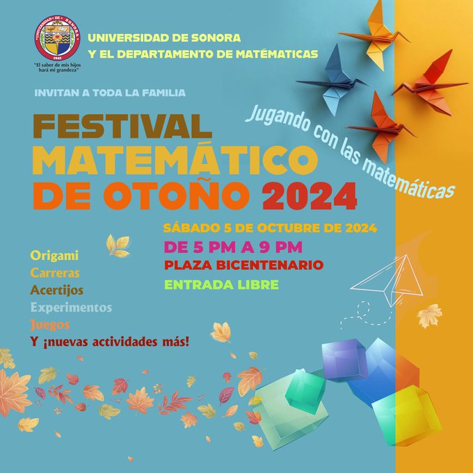 La Universidad de Sonora, a través del Departamento de Matemáticas, organiza el ya tradicional Festival Matemático de Otoño 2024, mismo que brindará a la comunidad en general la oportunidad de divertirse y aprender sobre esta ciencia.