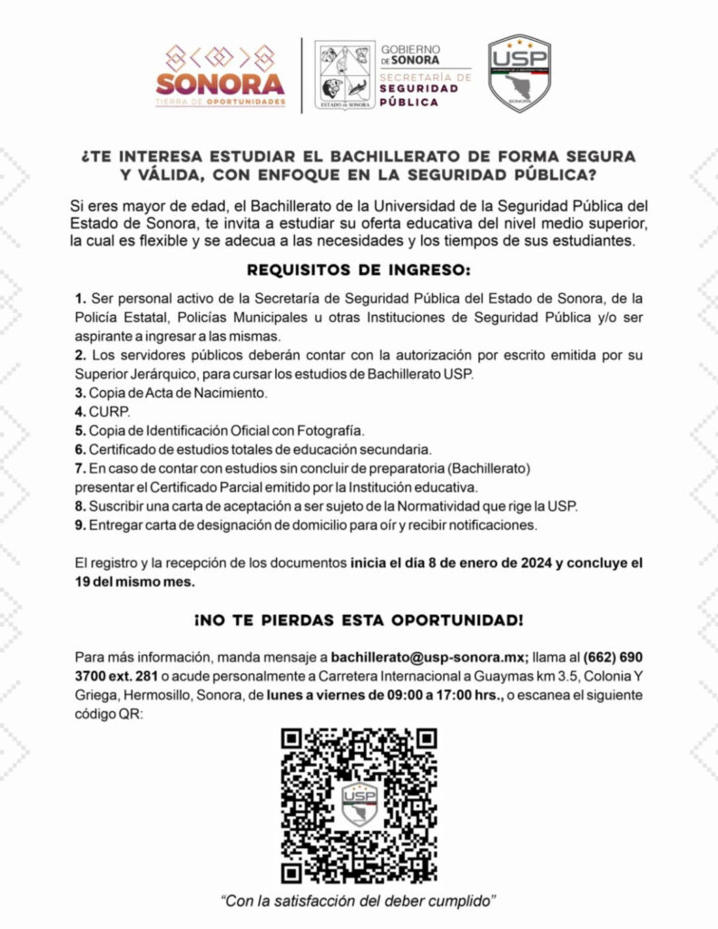 Para mayor información recomendó, enviar correo electrónico a bachillerato@usp-sonora.mx, llamar al (662) 690 3700 ext. 281 o acudir personalmente a carretera internacional a Guaymas km 3.5, colonia Y Griega en Hermosillo, en horario de lunes a viernes de 09:00 a 17:00 horas.