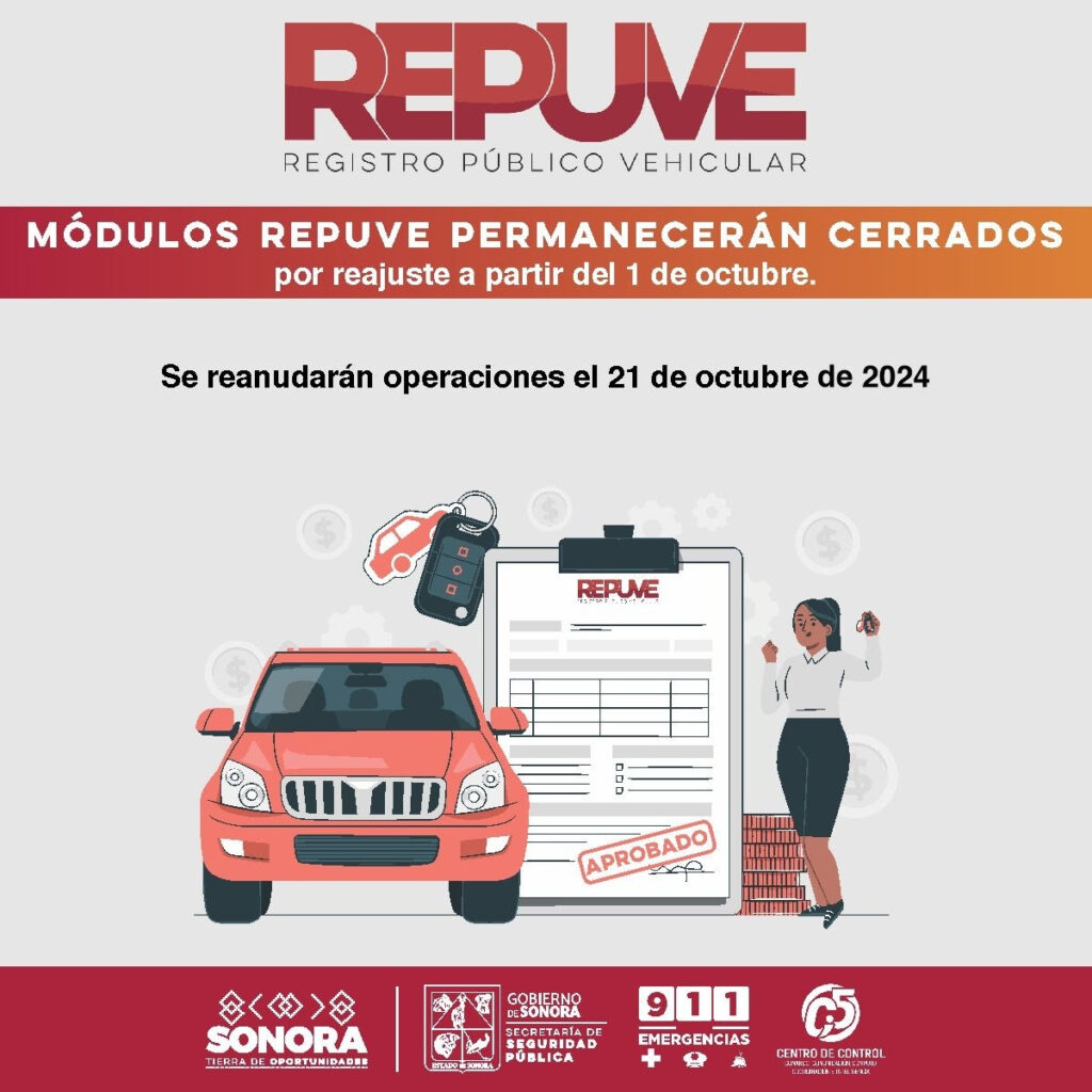 Por un proceso de reorganización interna, los módulos del Registro Público Vehicular (Repuve) en Sonora estarán en receso del 2 al 21 de octubre del presente año, anunció la Secretaría de Seguridad Pública (SSP).