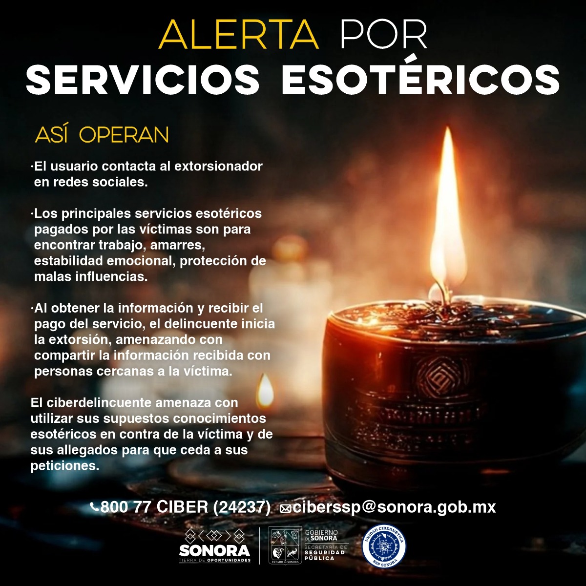 Jesús Mario Gastélum Rochín informo que en esta ocasión ofrecen el servicio de esotérico en los cuales le garantizan hacer amarres, encontrar trabajo, estabilidad emocional y protegerse de malas influencias. Sin embargo, los ciberdelincuentes utilizan la información que proporcionan las personas para extorsionar y amenazar a la víctima con utilizar en su contra y de sus allegados estos supuestos conocimientos mágicos.