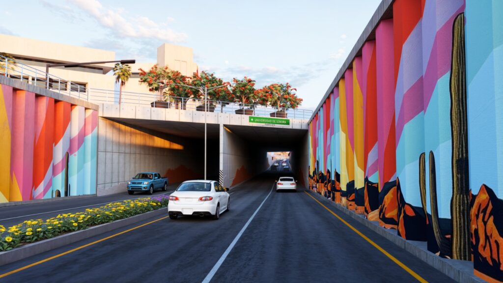 • Incluye la modernización de 3 cruces semaforizados, en las intersecciones del bulevar Colosio con el bulevar Solidaridad y el cruce de esta misma rúa con las calles Real del Arco Norte y Real del Arco Sur, lo que incluirá la renovación de estructuras y luces, así como la colocación de semáforos peatonales.