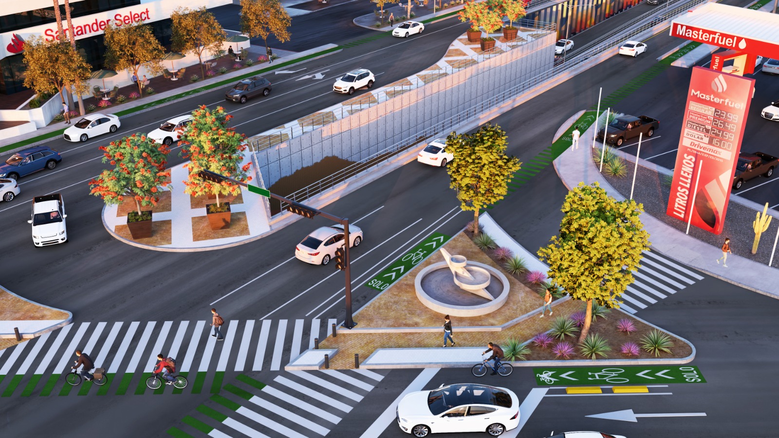 • A los cruces peatonales de la intersección se les dará resalte y jerarquía colocando concreto estampado en la vialidad, además de reforzar su función con 6 semáforos peatonales protegidos con guarniciones, y 9 más en los 2 cruces que también tendrán intervención, en Colosio con Real del Arco Norte y Real del Arco Sur, para un total de 15 en toda la obra.