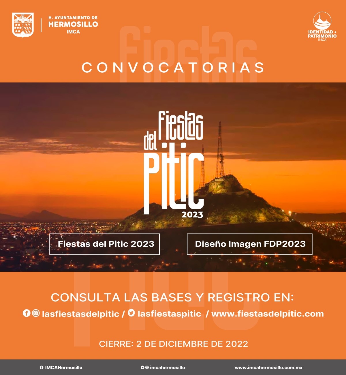 Las propuestas deben aludir a la identidad, cultura y sitios emblemáticos del municipio de Hermosillo y pueden incorporar fotografías como parte del diseño. En caso de no ser de autoría propia incluir la autorización por escrito de la fotógrafa o fotógrafo. El logo oficial a incluir en todas las creaciones se puede descargar en la liga https://hmo.digital/fiestasdelpitic/imagen el jurado de este concurso estará integrado por el comité organizador de Fiestas del Pitic 2023 y especialistas a quienes se invitará, cuyos nombres se darán a conocer una vez emitido el fallo, el cual será inapelable e incluye como premio 20 mil pesos. Con dicho pago el IMCA adquiere los derechos de uso y propiedad intelectual de la imagen ganadora.