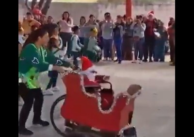 La docente convirtió la silla de ruedas del niño en un trineo navideño y lo vistió como Santa Claus, dándole la oportunidad de participar plenamente en la presentación.