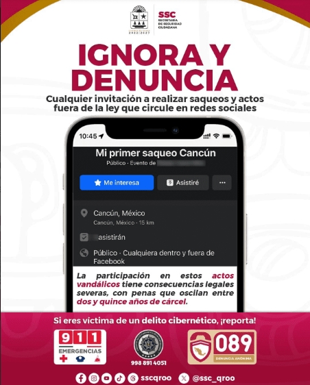 “Denuncia perfiles sospechosos: Si ves perfiles que incitan al saqueo, comunícate al 9988914051 para reportarlo o comunícate con la Unidad de Policía Cibernética de Quintana Roo”, finalizó.