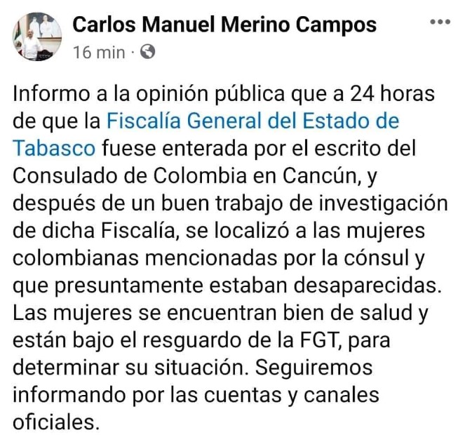 Carlos Manuel Merino Campos, gobernador del Estado de Tabasco, dio a conocer que fueron halladas las 9 mujeres colombianas presuntamente secuestradas por miembros de un cartel que habrían contratado sus servicios como acompañantes. En un breve comunicado para las redes sociales aseguró que se encuentran bien de salud.